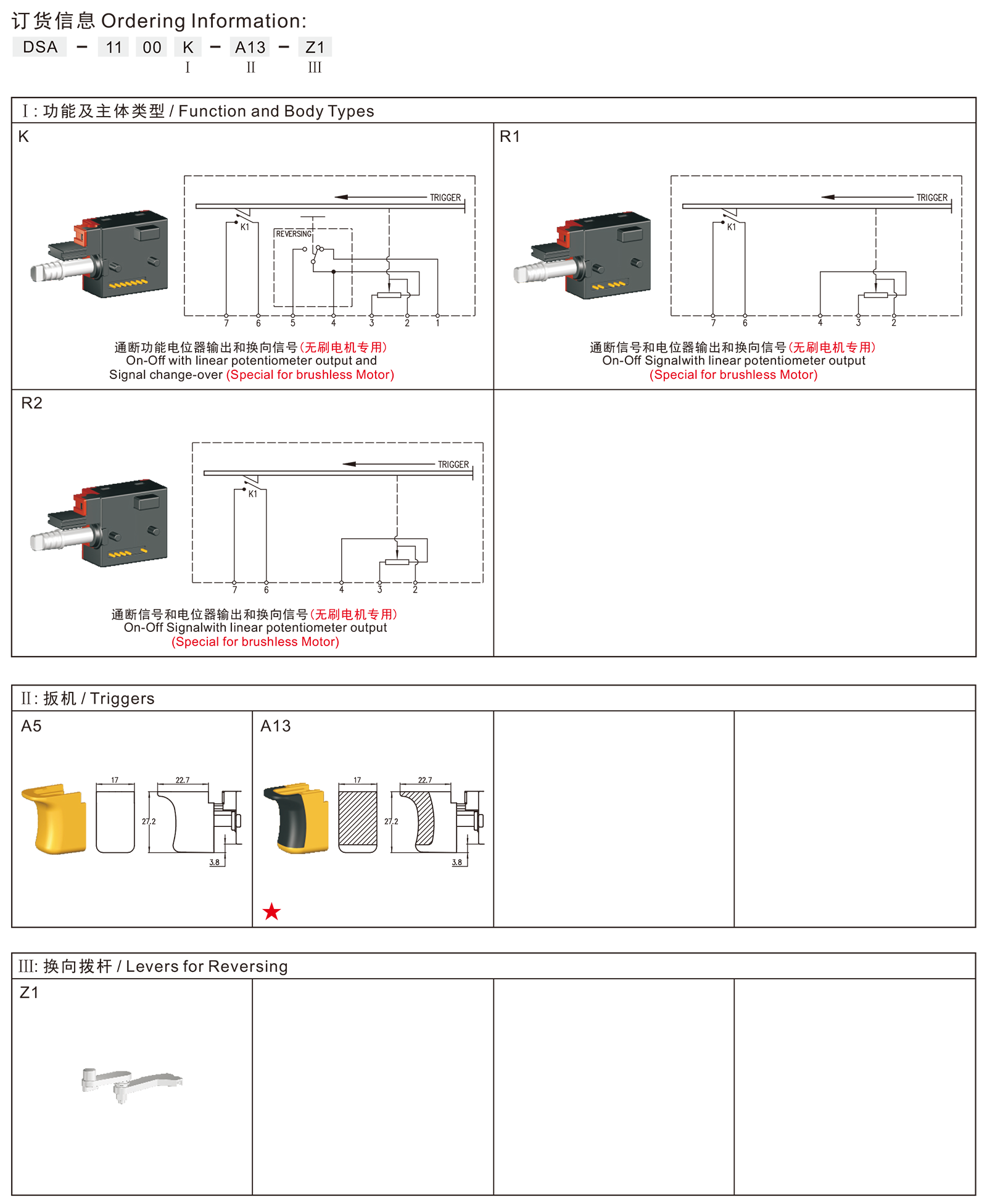 ◆DSA series are one special type DC signal trigger switches, integrated dustproof, designed specially for used in Brushless DC power-tools such as: Brushless Cordless Drills, Brushless Cordless Screw Drivers, Brushless Cordless Impact Wrenches,etc. With special design for assembly with PCB, needn't any wires.