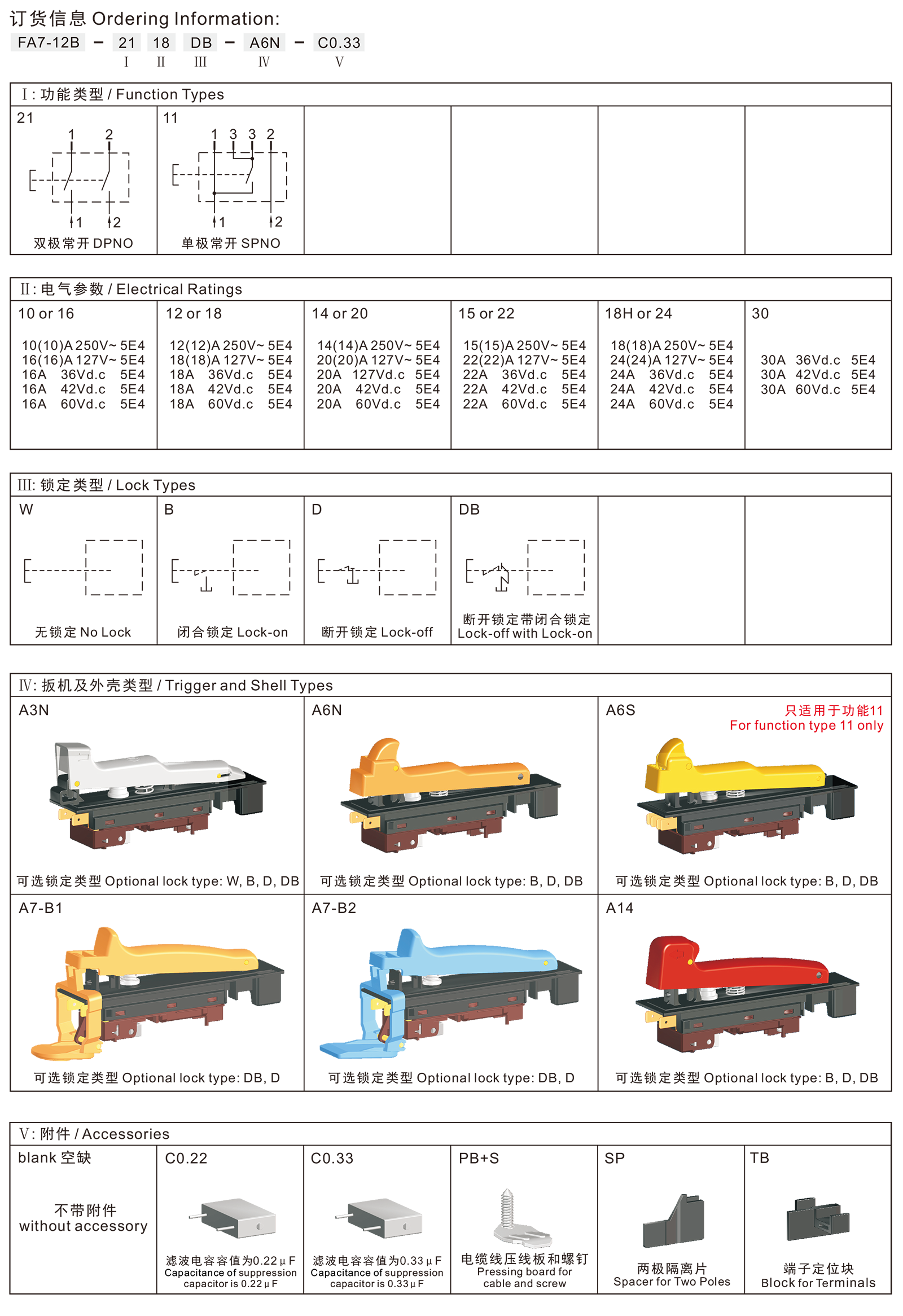 FA7-12B series are special type high rated trigger switches, integrated dustproofwith snap-action structure, for used in high rated bench top or portable power-tools such as Cut-off Machines, Miter Saws, 180mm and 230mm Large Angle Grinders, Heavy Rotary Hammers, Heavy Demolition Hammers, etc. The body and trigger accept customize according to customer's request.