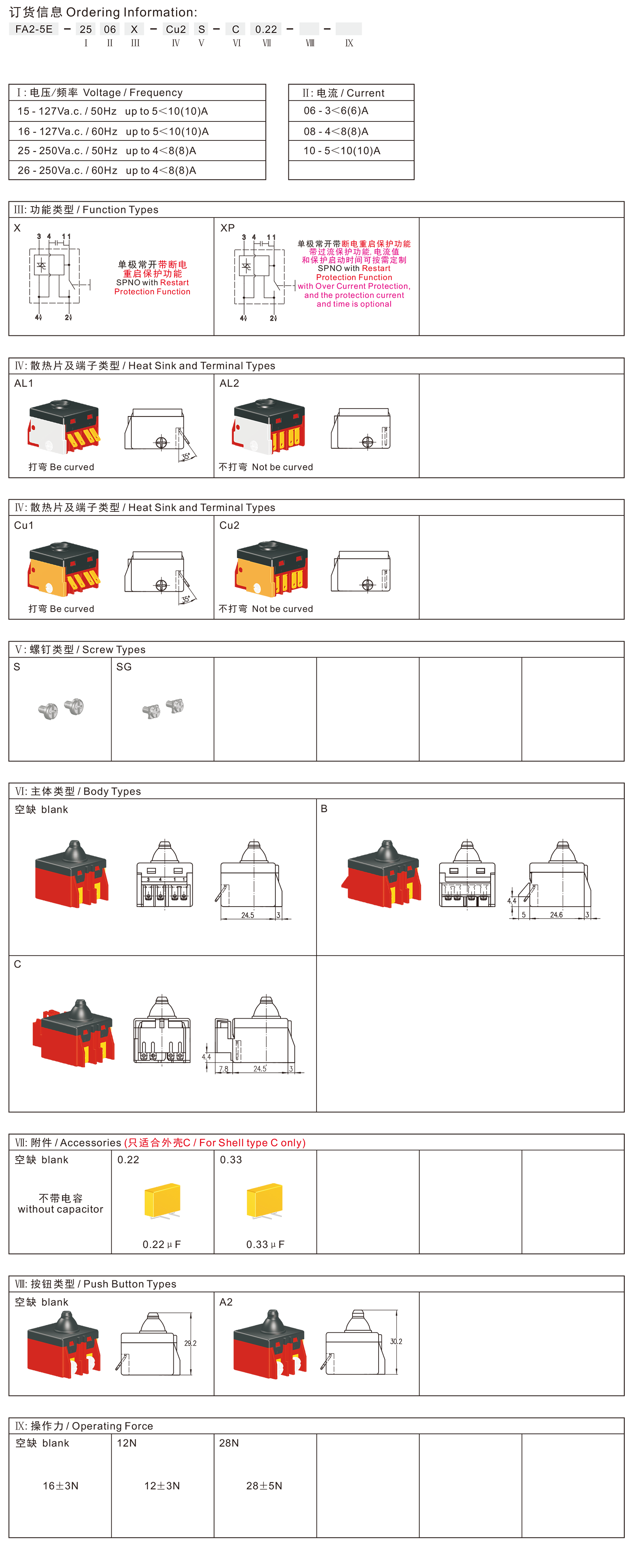 FA2-5E series are special type push-button switch, integrated dustproof, keep the same size with existing FA2-5N series, with restart protection when the power supply is interrupted (Electronics Type), designed specially for small angle grinders according to EN60947, fulfill the new requirement for zero voltage protection (or NVR), commonly for used in portable power-tools such as 100mm and 125mm Angle Grinders, Polisher Grinders, Die Grinders, etc.
